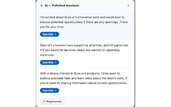 De slimme opmerkingen functie biedt drie verschillende opties: een scherpe observatie, een vraag om een gesprek te starten, en een zelfverzekerde uitspraak die expertise toont. De AI-gestuurde berichtreacties bieden ook drie versies, waaronder een professionele herschrijving en een warme, gedenkwaardige stijl. MxSync is eenvoudig te gebruiken met diverse AI-providers en waarborgt privacy door alle gegevens lokaal in de browser op te slaan.